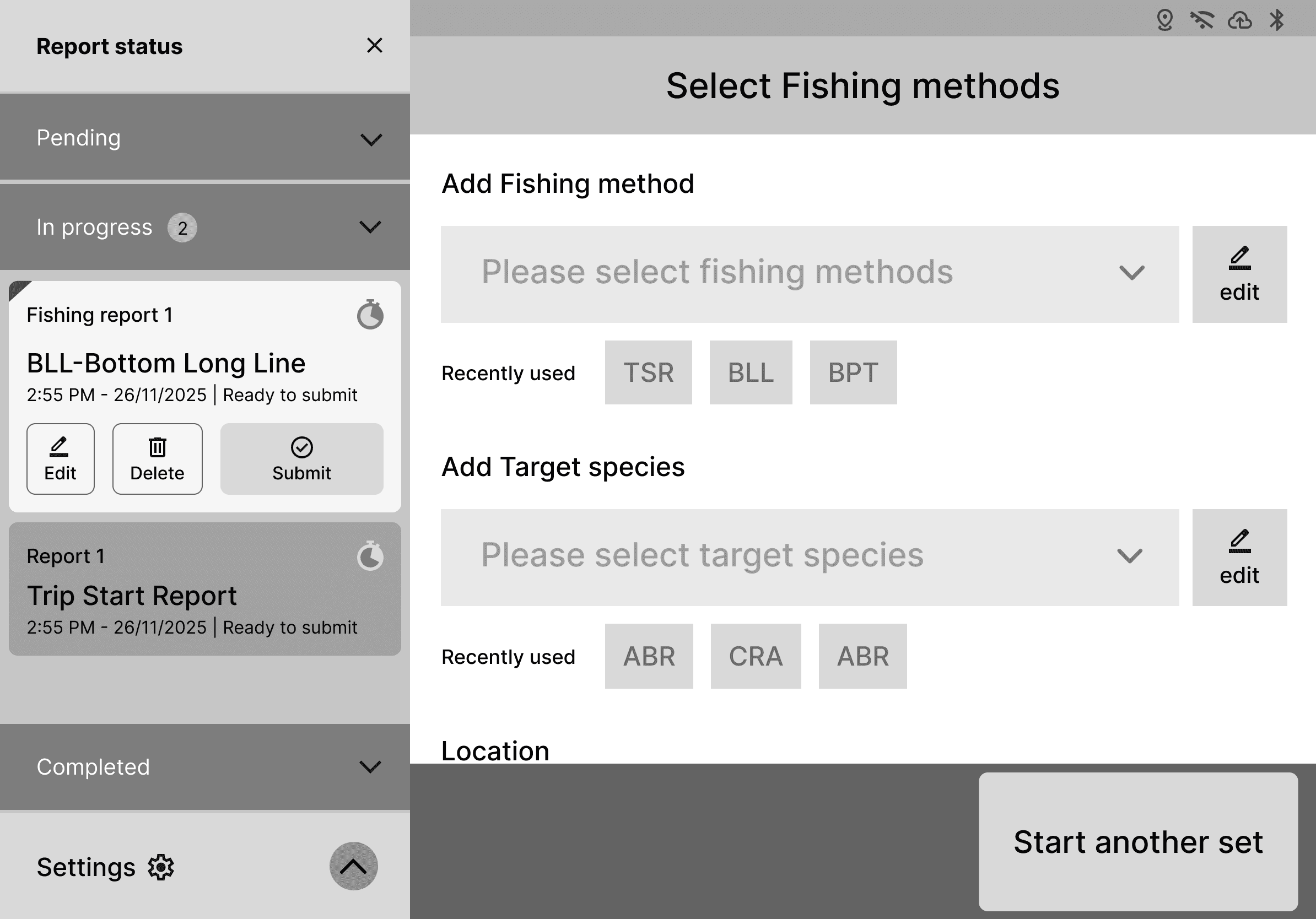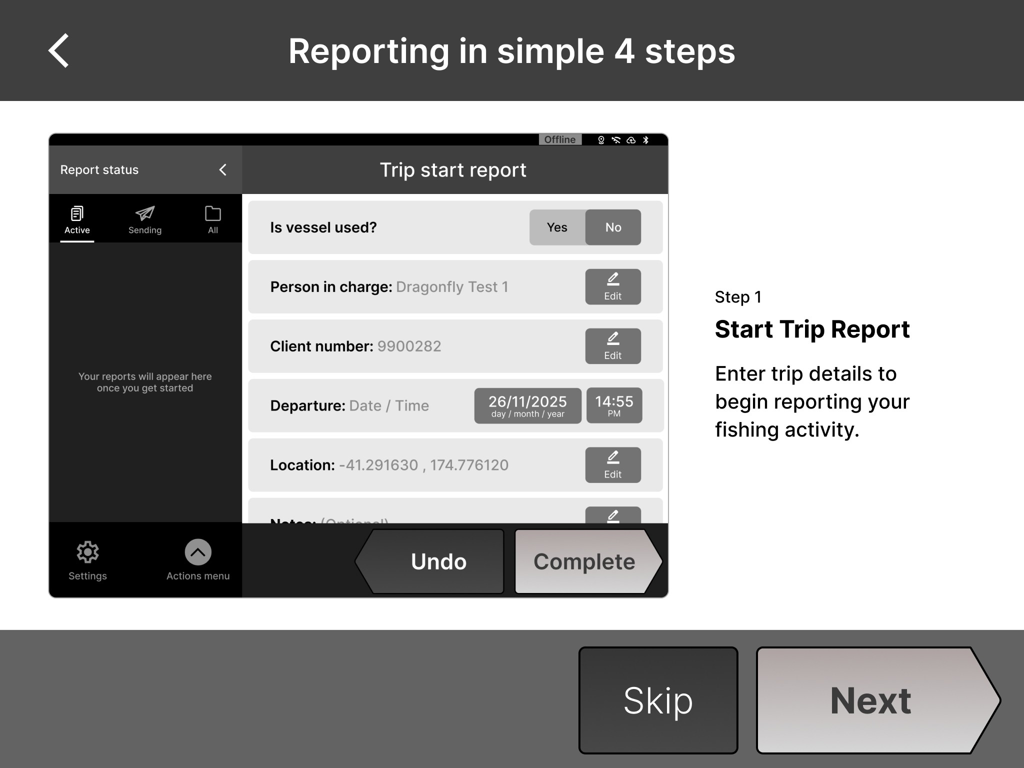 Due to limited access to fishermen, we tested 3 concepts with 3 Dragonfly employees who where new to Deckhand. The testing focused on reporting panel, timer and report status.