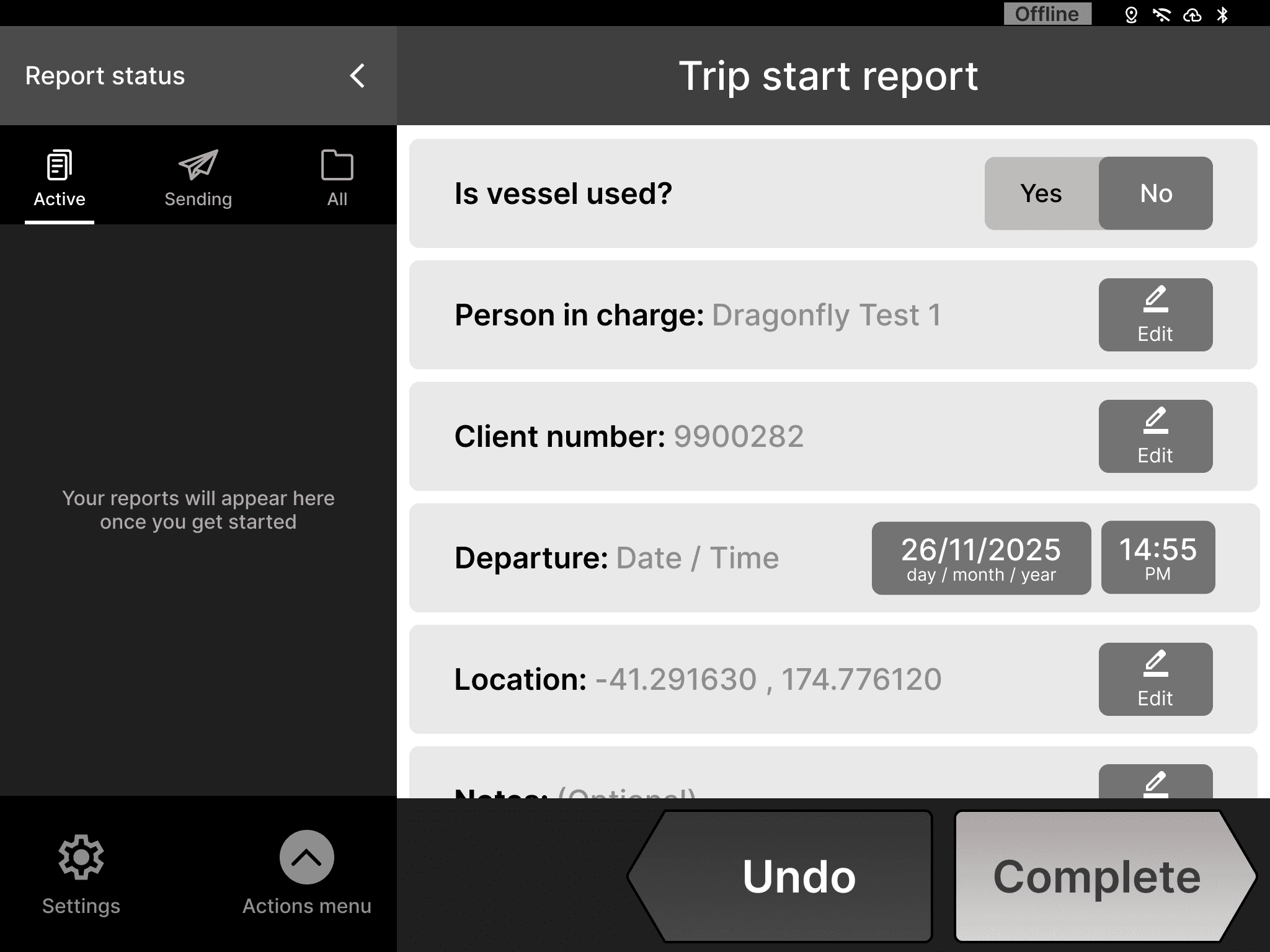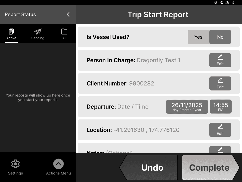 Enter your trip start report data on this page, click the “Edit” button if you want to make any changes