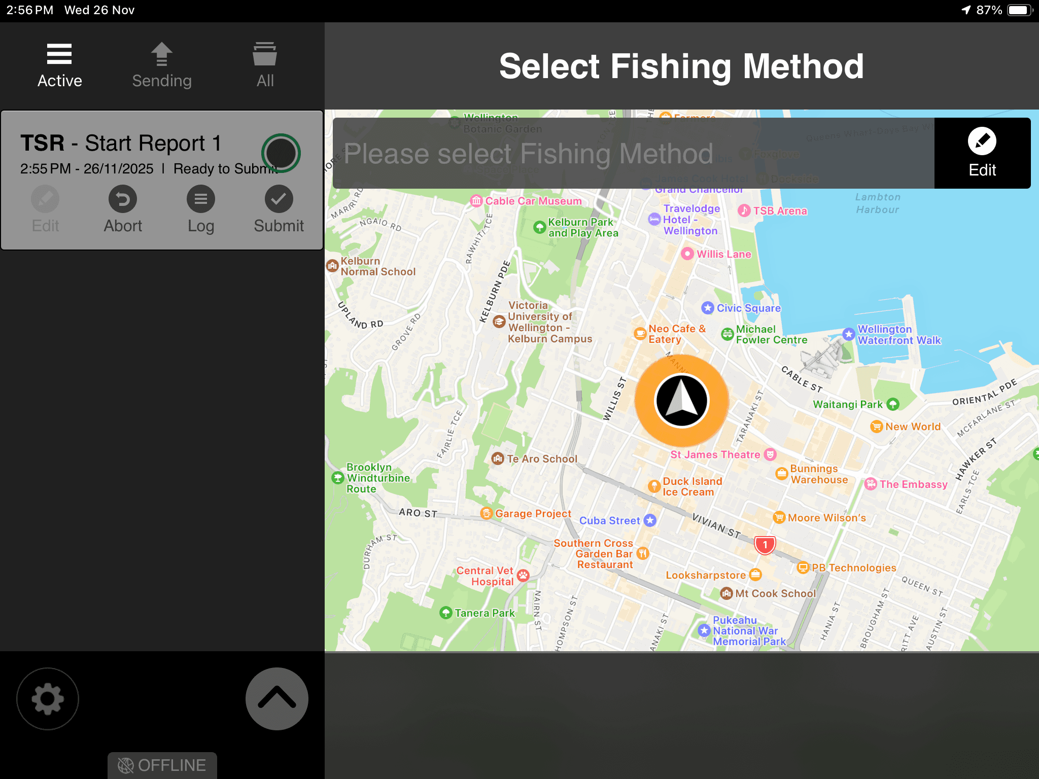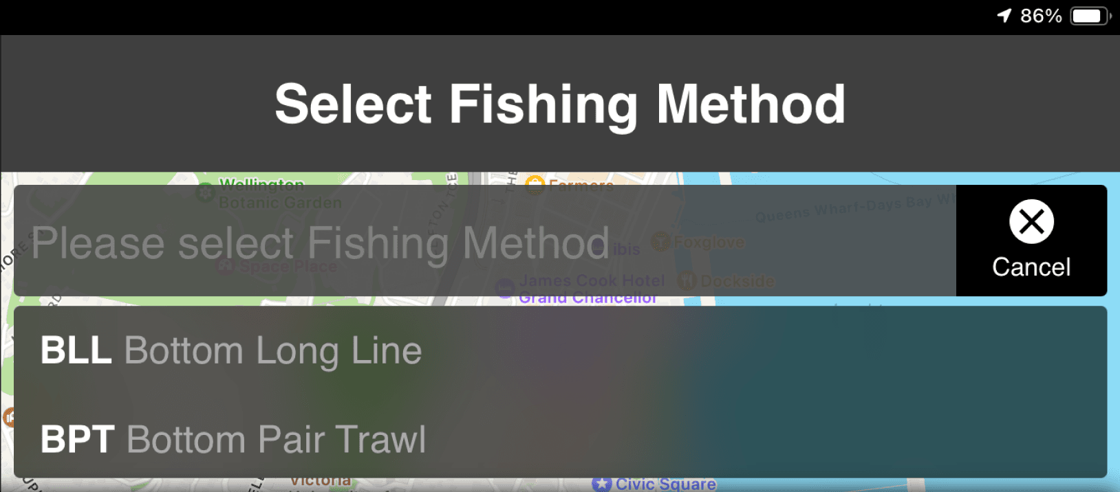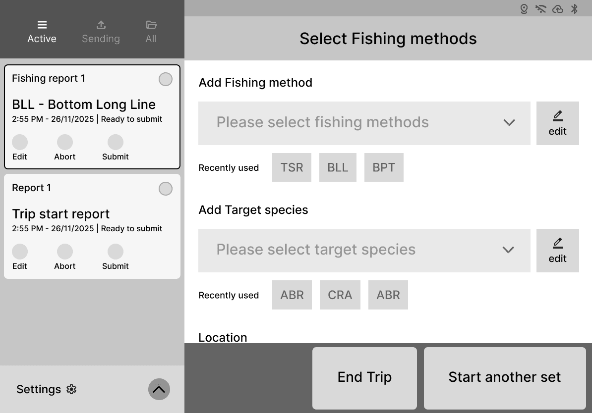 The reporting interface used for data entry and fishing method selection