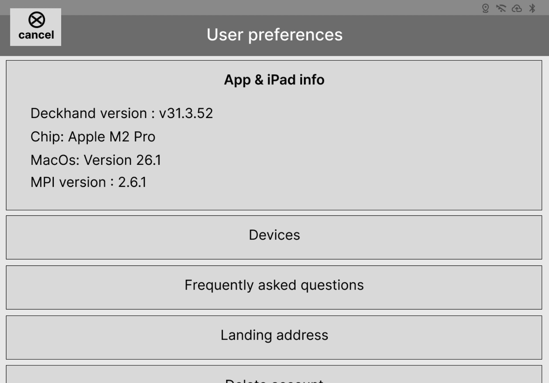 Added a system status bar (location, Wi-Fi, Bluetooth) to support users and assist customer support with troubleshooting.